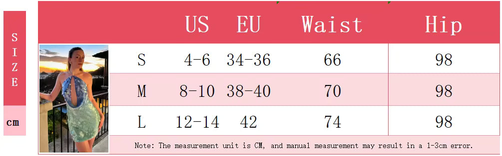 Com um decote halter sofisticado, o modelo valoriza os ombros e o colo, enquanto o design em retalhos azul e verde cria um efeito visual luxuoso e exclusivo, refletindo a luz de forma deslumbrante. O corte curto e justo realça a silhueta, proporcionando um look feminino, glamoroso e ousado na medida certa.